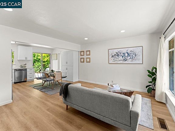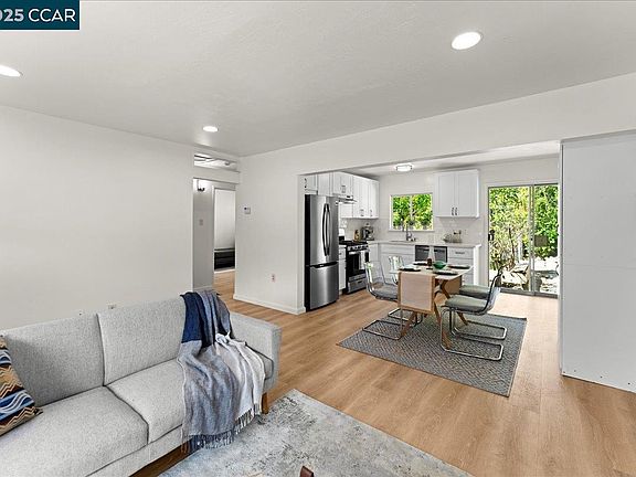Welcome to your private bungalow retreat. This single-story, 2-bedroom, 1-bathroom upgraded home features new LVP flooring, fresh paint, and an updated bathroom. The eat-in kitchen is modern and ergonomic, with brand-new stainless steel appliances, custom cabinetry, and quartz slab counters. An open flow from the kitchen to the living space and outdoor deck enhances natural light and airflow. The spacious attached garage offers additional storage solutions or potential expansion opportunities. A long tandem driveway provides parking for 2–3 cars. The property sits on a generous double-sided lot with level yards and convenient access from both Evergreen Ave and Forestland Way. This home is an excellent opportunity for first-time buyers or downsizers seeking a quality property in a highly sought-after Oakland Hills neighborhood.