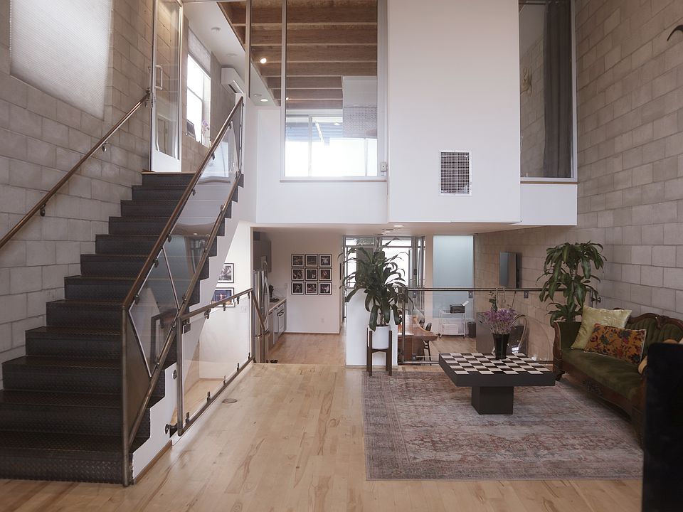Second Level: Soaring ceilings with flexible work space, 2 offices/studio spaces, a full kitchen with stone counters and stainless steel appliances, and a full bath.