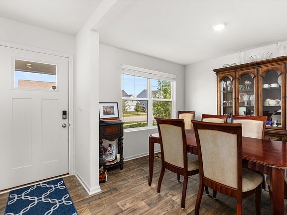 Welcome to beautiful Legacy Pointe! Why wait for new construction when this stunning two-story home, built in 2022, is ready for you now? Offering 4 bedrooms, 2.5 bathrooms, a 2-car garage, and a full unfinished basement, this home has been thoughtfully designed with both style and function in mind. A versatile study, currently being used as a dining room, greets you upon entry. The hallway then opens into a spacious living room, dining area, and an impressive kitchen featuring a large island with seating for up to four, designer white cabinetry, quartz countertops, and an oversized walk-in pantry. Upstairs, the primary suite boasts a private bath with a cultured-marble raised double-bowl vanity, walk-in shower, and separate water closet. Additional features include a tankless water heater, custom blinds throughout, and Smart HomeSM Technology for added convenience. Enjoy outdoor living with a 16x16 concrete patio and electric lighted awning in the backyard. The full basement has five added outlets for easy finishing, while the roof and HVAC come with transferable warranties for peace of mind.