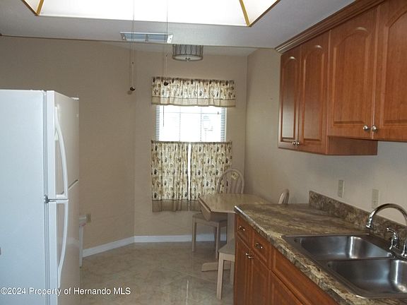 Kitchen has new cabinets and dining area. 2 bath, 2 bedroom, single car garage, plus golf cart garage adjacent to lanai. Lanai with acrylic