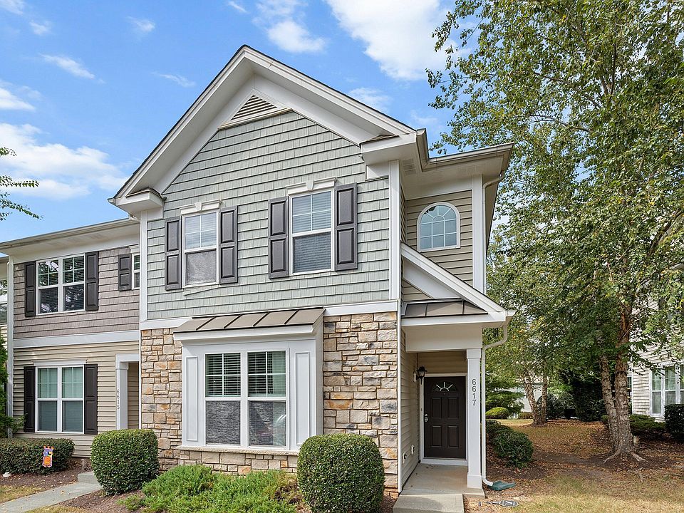 Charming townhome centrally located in Raleigh. An END UNIT that features extra windows and lots of light. The main living area is thoughtfully designed with a large family room and dining room that opens into an eat-in kitchen. The kitchen has ample cabinet and counter top space, a pantry and all appliances convey. What makes this kitchen special is a generous space for a table by a bright and sunny window - a perfect place to enjoy your morning coffee. The center island is a multi-functional space ideal for food prep and includes room for seating for casual dining. Upstairs you will find an exceptional primary bedroom suite with a private bath, vaulted ceiling and triple windows that create a bright and elegant space. You will appreciate the size of the walk-in closet. Two other bedrooms are upstairs and the washer/dryer are situated in the hallway for convenience. There is a pull-down stair with access to attic storage. The street is quiet and well maintained with two parking spaces that are assigned and numbered. A private patio off the family room features a utility room for additional storage. Only moments away from grocery stores, schools, shopping, entertainment and local services. Don't miss the opportunity to call 6617 Clarksburg Place home.