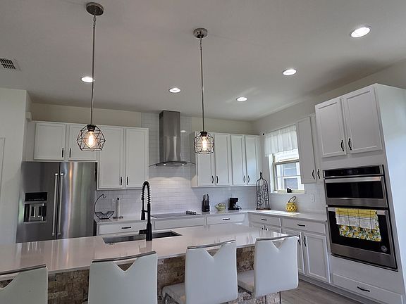 Gourmet kitchen quartz countertops, large island, stainless steel appliances (refrigerator, microwave, oven, dishwasher), plus cookware, dishes, and utensils