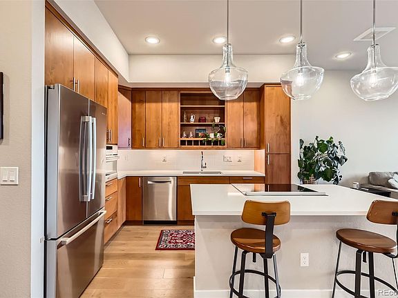 Location, location, location! Welcome home to this thoughtfully designed 3rd floor unit with inviting open concept floorplan. Boasting 10 ft. ceilings and gorgeous windows that flood the space with natural light, the spacious living room and kitchen area are perfect for both relaxation and entertaining. The chef-inspired kitchen is equipped with high end appliances, an induction cooktop, custom cabinetry with soft-close features, quartz countertops and an oversized island. The primary suite has a generous walk-in closet and an ensuite bathroom, complete with a custom-tiled shower and frameless glass door. The felx room is ideal for a home office or a non-conforming second bedroom — just add a Murphy bed for the perfect guest space. Relax on your private balcony with views of Crestmoor Park just across the street, or enjoy the convenient access to nearby restaurants, shopping, and parks. With easy routes to downtown Denver and Cherry Creek, this location offers the best of Lowry living. The unit also includes storage unit and deeded underground parking.