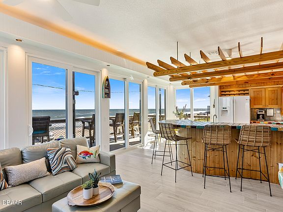 Welcome to ''Little Latitude,'' a one-of-a-kind oceanfront retreat set along the picturesque Bethune Beach Promenade. This vibrant beach house captures the carefree Margaritaville spirit with a perfect blend of coastal charm and relaxed elegance. Step into a world where every detail invites tranquility — where dual panoramic views of the Atlantic Ocean and Intracoastal Waterway frame your days. This custom home features over 1,100 SF of elevated outdoor living space, including multiple oceanside decks and a sheltered rooftop crow's nest offering breathtaking views of rocket launches from the Kennedy Space Center. Designed for versatility, this property offers two separate living spaces with private entrances—ideal for multi-generational living, guest privacy, or rental income potential. The main level offers 2 bedrooms and 2 full baths with an open-concept living area, floor-to-ceiling oceanfront sliders, a spacious kitchen with breakfast bar, and a dining area showcasing panoramic views. The lower level features 2 bedrooms and 1 bath, a cozy living area, and a kitchenette with full-size appliances. Enjoy seamless indoor-outdoor living with wrap-around decks, tropical landscaping, and beach access just steps away. Whether watching dolphins at sunrise, rockets launching at sunset, or relaxing under the stars, "Little Latitude" is a coastal haven where every day feels like a vacation. Additional features include: laundry rooms on both levels, multiple smart TVs, separate entrances for privacy and flexibility, and full furnishings. The county-maintained concrete seawall and staffed lifeguard station provide peace of mind. Meticulously maintained and updated with new windows, sliders and exterior doors, tile flooring throughout, two HVAC systems, and a new metal roof (2023). The property also offers an outdoor shower, firepit, BBQ area, and enclosed garage. Manatee Park, located nearby, features a volleyball court, fishing pier, and kayak launch where dolphins and manatees are frequently seen. Within minutes of upscale dining, boutique shopping, private marinas, and the charm of historic Flagler Avenue, this beachfront home offers the perfect balance of exclusivity and accessibility. This is your ultimate entertaining beach home offered fully furnished, where all you need to bring is your toothbrush --and maybe your flip flops. Come see this unique property for yourself and make it yours today!