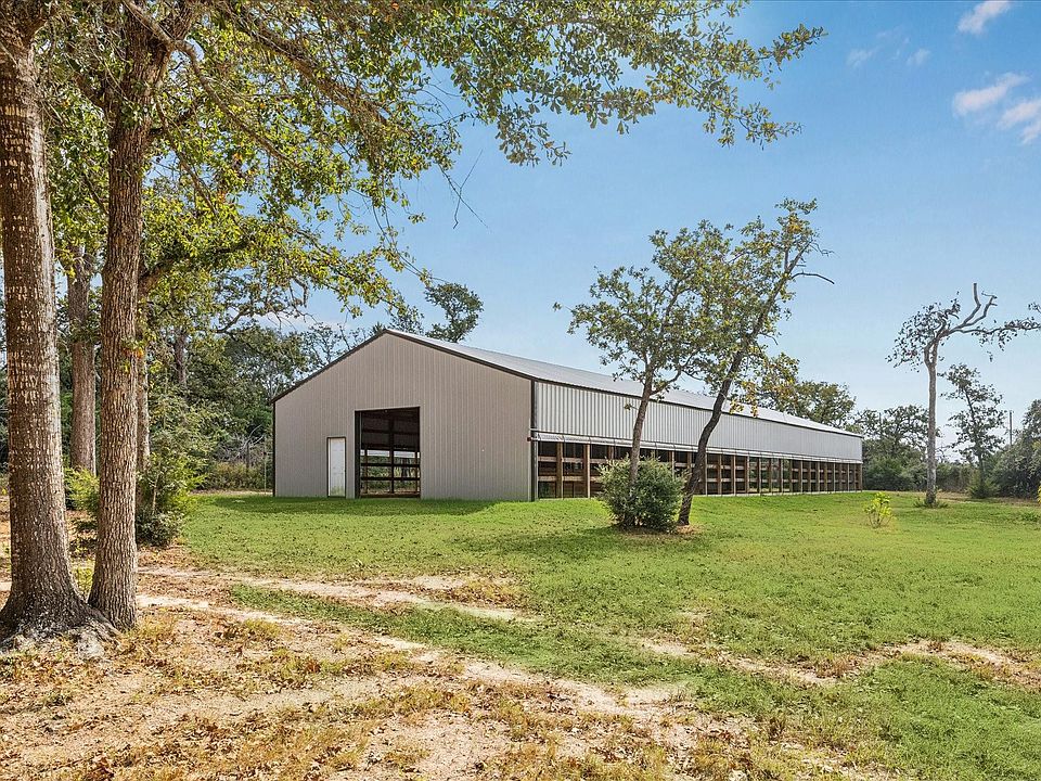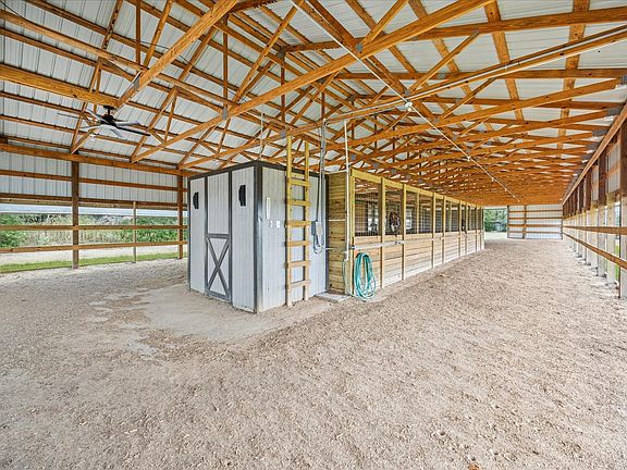 This beautiful and private +/-5.2 acres is for the equestrian lover that wants a move-in ready gorgeous training barn! Built in 2024, the 4,800 square foot facility boasts 4 stalls, complete with tack room, automatic water to each stall, and lights. The dimensions are 120 X 40, with a 10 foot roll up garage door on each end and roll-up vinyl on the long sides. The remainder of the siding and roof are metal. The stalls are located in the center of the barn, allowing room for training on the perimeter dirt floor. There is a 30 x 14 carport with an enclosed space with plumbing rough in for a bathroom, and an additional storage closet. There are several locations on the property to build your dream home. The site has plenty of mature hardwood trees, providing shade over the majority of the property. This pie shaped parcel is completely fenced, with high game fencing along two of the three sides. Call today for your private tour.