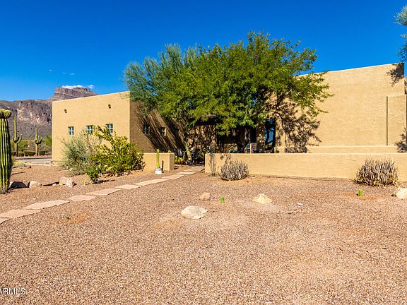 Designed to capture sweeping Superstition Mountain views, this custom home rests on just over an acre in Gold Canyon's desirable Superstition Highlands, located on the west side of town. Enter through a mesquite-shaded courtyard into the open concept living area with propane fireplace. The island kitchen offers tile counters, walk-in pantry, and stainless appliances (2023). Spacious primary suite is filled with natural light; ensuite includes dual vanities, soaking tub, step-in shower with dual heads, mirrored walk-in closet, and patio access. Paver patio spans the length of the home with multiple seating areas to enjoy panoramic views, colorful sunsets, and desert wildlife. Large laundry room includes built-in desk and cabinetry. Oversized 2.5-car garage. Recent upgrades: laminate flooring (2023), AC (2023), roof (2024), exterior paint (2025). Quiet, upscale community borders Tonto National Forest with hiking trails steps away, yet quick access to Hwy 60 via Mountain View Rd.