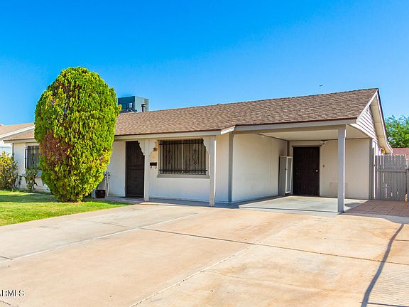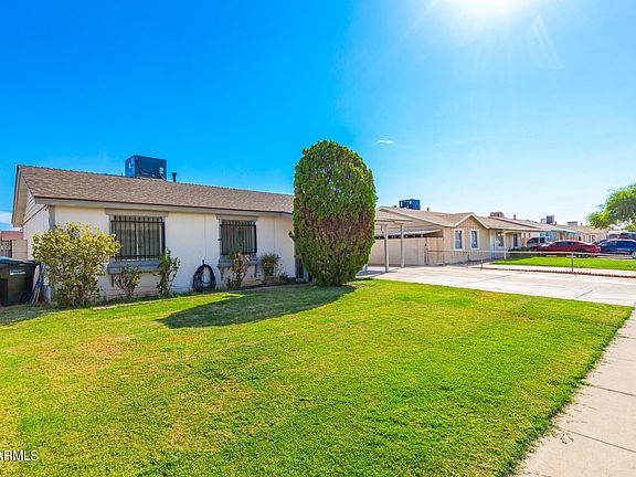 Welcome to this charming 4 bed, 2 bath single-level home! Displaying a front yard w/lush lawn and a carport parking w/extended driveway. Inviting interior showcases a neutral palette, wood-look tile flooring in common areas, and carpet in bedrooms. The formal living room is perfect for receiving guests! The eat-in kitchen boasts built-in appliances, ample cabinets, and sliding doors to the back. Main bedroom has a private bathroom for added comfort. Check out the large backyard, featuring a covered patio & storage shed! With your creative ideas, you can make it a complete outdoor oasis. Conveniently located close to schools, shopping, dining, and freeways. PLUS! This gem is directly across the street from Desert West Park with a rec center, sports courts, greenbelt, & more. Make it yours!