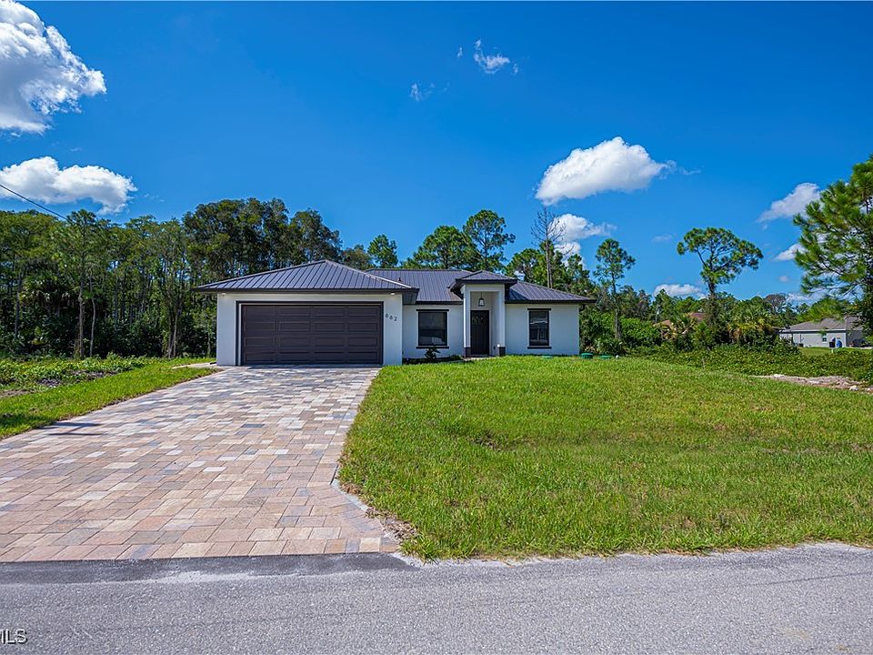 Beautiful, open concept New Construction, 3 bedrooms, 2 bathrooms, 2 car garage home, on a desirable neighborhood, brushed nickel faucets, custom light fixtures, ceiling fans, cordless blinds, beautiful tile throughout, coffered ceiling in master and living room, double vanity in master bathroom, custom mirrors in bathrooms, garage epoxy floor. Upgraded pavers on driveway, walkway, and lanai, under truss lanai, Custom wood kitchen, bathroom, and laundry room cabinets with soft close, granite in kitchen and bathrooms, Stainless steel appliances. LED lights, automatic Irrigation system. Minutes from state road 82, restaurants, shopping stores, recreational parks, and schools. IMPACT WINDOWS, DOORS AND METAL ROOF!