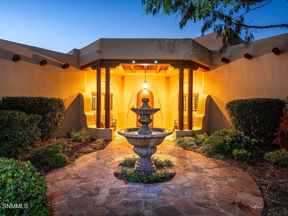Unique, Santa Fe Style, custom built home! 3 bedrooms & 2.5 bathrooms of pure southwestern elegance! Sprinkled throughout the entire home are La Tia and custom carved wood beam ceilings, corbels, lit nichos, & exquisitely designed hallways, doorways, & accents! Granite countertops, custom made Kowalski cabinetry, custom made glass inserts to match light fixtures, & an abundance of huge windows to take in the amazing views of Picacho Peak, the north valley, and the Organ Mountains. Primary suite is spacious with a flex room and luxurious bathroom! Separate shower, jet tub, double sinks, built-in vanity light, linen closet and more! 3rd bedroom is currently being used as an office with custom built-in desks and cabinetry. Garage space is a DREAM with an oversized 3rd car garage (used to have a lift in it), a workshop area and TONS of built-in storage. Skylights, extra lighting and tool electrical outlets as well. You won't want to miss owning this GORGEOUS home in a gated community.