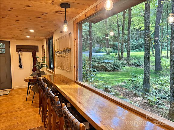 The dining area is a showpiece in itself, centered around a custom built-in table framed by massive windows. Meals here feel like picnics in the forest, with ever-changing scenery: vibrant summer leaves, fiery autumn color, and in winter, glimpses of mountain peaks that sparkle beneath the Eastern sky. The kitchen blends sleek modern style with rustic woodsy charm. A spacious coffee bar makes mornings a delight, while updated cabinetry, appliances, and thoughtful layout keep the design both beautiful and functional.