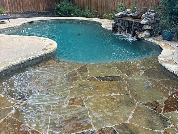 Salt water poolLarge treesGrassy areaBackyard oasisHardwood flooringCork flooringRock water fall