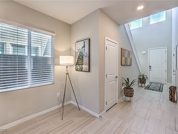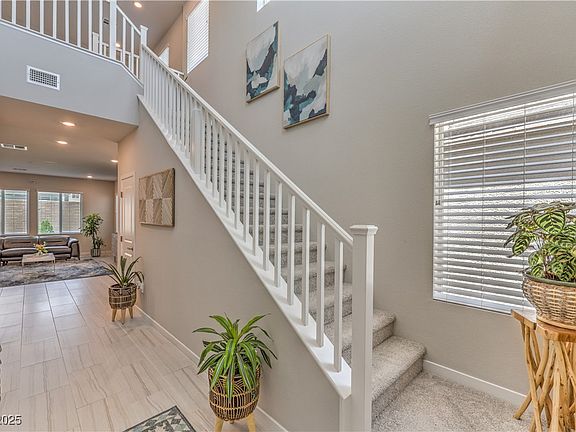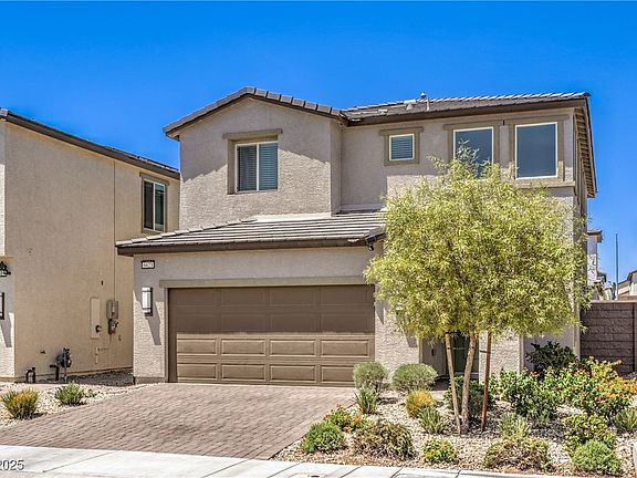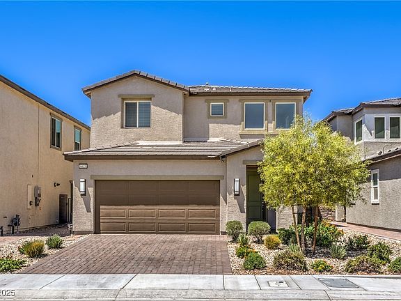 SELLERS CURRENT LOAN IS ASSUMABLE AT 3.25%. CALL AGENT WITH QUESTIONS. Gorgeous! Highly desirable turn key home! This 4 bedroom, 3 full bath, plus a spacious loft, includes a full bathroom and bedroom downstairs! Pavestone driveway and walkway, with desert landscaping. Energy efficient home with solar panels, dual pane windows, tankless water heater and alarm/camera system. Upgraded grey tile and carpet floors. Beautiful entranceway with lots of natural lighting, leading to open living space, kitchen, bedroom and full bath. Kitchen has a large island/breakfast bar, white quartz countertops, espresso cabinets, stainless steel appliances and pantry. Large laundry room upstairs. Master suite has high ceiling, walk-in-closet and dual vanity. Come outside and enjoy a beautifully done, pool size low maintenance backyard with artificial grass, pavers, plants, and covered patio. Community also has a park with playground. Minutes away from shopping, the 215, VA hospital, Nellis & Creech AFB.