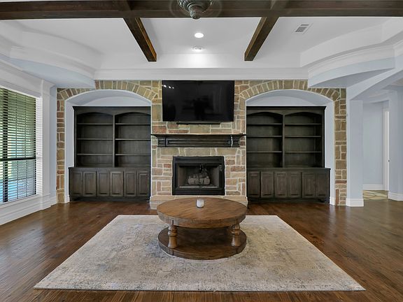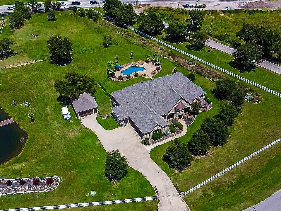 Stunning single-story residence situated on more than 6 acres, comprising a master suite and 4 additional bedrooms, each with en-suite bathrooms, a stocked pond, a stable, a corral, a 3-car garage, and a separate 2-car garage. The master suite includes dual vanities, medicine and linen closets, jetted tub, makeup counter, separate shower, and spacious walk-in closet. The gourmet kitchen is equipped with two sinks, pot filler, level kitchen island featuring a breakfast bar, granite countertops, and stainless steel appliances. The living room boasts high ceilings, stone fireplace, wine cabinet, and exposed stained beams. A home office is located off the entryway and includes built-in cabinets. Media room and bonus room are off the kitchen, making it the perfect entertaining space. The property is cross-fenced to create a private backyard area along with pasture space for animals, 2 large separate pens with stalls and tack-feed room on end. Water and electric at barn. Large covered patio overlooking the pool. Carpet in bedrooms replaced August 2025. Roof replaced September 2025.