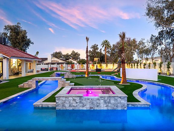 Welcome to your ultimate private getaway, where the main house offers generous living space, a fully equipped kitchen, and multiple hangout zones. The casita provides added privacy with its sleeping quarters and amenities. Outside, your private resort awaits with a lazy river, basketball court, putt-putt, and expansive backyard filled with games and lounging areas, ideal for entertaining or soaking up the Arizona sunshine.