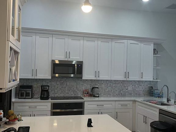 Enjoy an open kitchen with granite countertops, 42" wood cabinets, stainless steel appliances, and water filtration system. High 12' tray ceilings, 8' doors, Hunter ceiling fans, and Levolor blinds throughout. Screened lanai, lush landscaping with palm trees, and more
