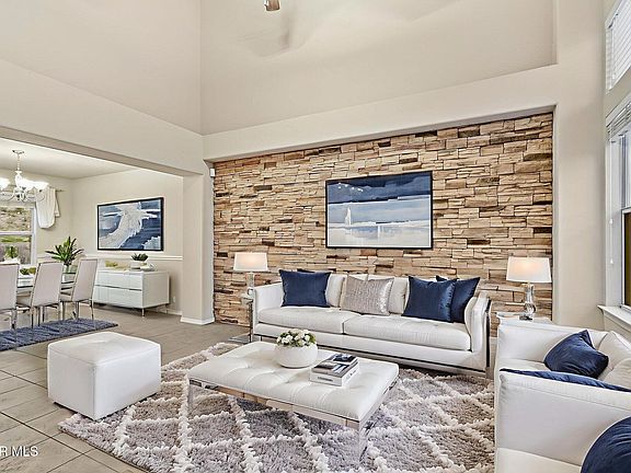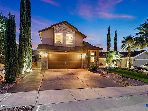 Beautifully maintained and truly move-in ready, this 4-bedroom, 3-bath home offers both style and comfort. The front and backyard are fully landscaped with mature trees, palms, and elegant night lighting for outdoor enjoyment. Exterior rock accents carry inside, where the living room and den showcase decorative stone walls, with the den also featuring a cozy gas fireplace. The kitchen boasts granite countertops and comes fully equipped with stainless steel appliances, including gas stove, refrigerator, dishwasher, microwave, plus washer and dryer. The spacious master suite includes double vanities, soaking tub, and walk-in shower. A convenient laundry room is located inside the home. Nestled in a quiet neighborhood with breathtaking views of the Franklin Mountains and just minutes from West Towne Marketplace with 20+ restaurants, cinema, and gyms. A turnkey home ready to welcome its new owners!