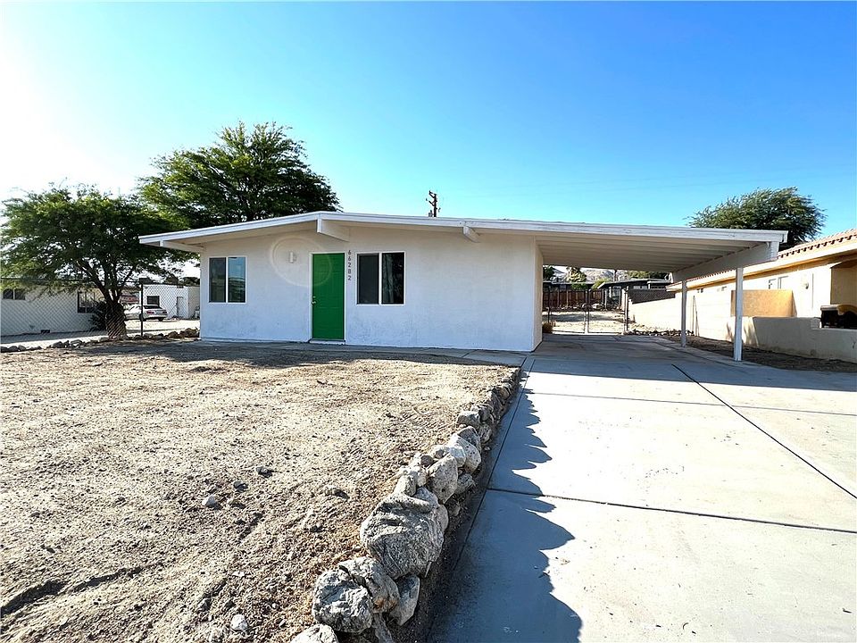 Welcome to Desert Modernism. A newly remodeled mid-century modern home in the heart of Desert Hot Springs surrounded by the stunning views of the San Jacinto Mountain range. This home features two bedrooms and one bathroom with brand new luxury vinyl flooring flowing through the entire home. The bathroom has been updated with a new toilet, custom tile, and vanity. The newly remodeled kitchen includes tasteful finishes and touches throughout, new lighting, custom cabinetry, quartz countertops, stainless-steel appliances, and an adjacent custom built, walk-in pantry. This beautiful home includes a spacious driveway with carport and large backyard with easy low maintenance desert landscaping with room to spare. This is the perfect home for a first-time home buyer or to purchase a rental property. No land lease or HOA. Move in Ready!