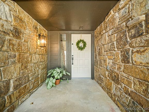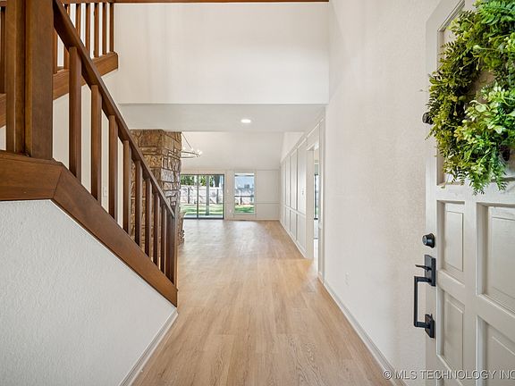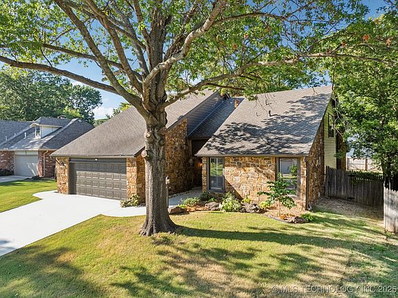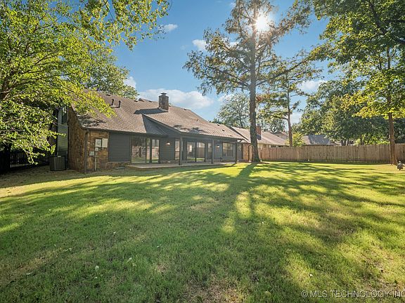 Beautifully transformed with a renovation inside and out in iconic Chimney Hills neighborhood positioned in the heart of South Tulsa and sought after Darnaby Elementary school district. A warm neutral style mixes sleek surfaces with rich wood and a rustic warmth from the massive stone fireplace. The impressive family room with wet bar & beverage fridge has a soaring ceiling and a wall of windows that overlook a new covered deck and freshly sodded backyard with plenty of room for pets or play or simply relaxing beneath the trees. This open plan with 2 bedrooms up 2 bedrooms down and 3.5 baths offers a flexible arrangement that works for any lifestyle. A formal dining room is perfectly positioned to be a secondary living or office space. The fourth bedroom up is large enough to be a game room. The laundry room has a new drop zone with plenty of cabinets and storage. The newly designed kitchen is truly the heart of this home with a pantry, prep island and carefully selected lighting, quartz surfaces and stainless appliances. The stylish primary suite is on trend with backyard access, dual walk-in closets and a bath with dual vanities, soaking tub and shower/wet area. A secondary bedroom on the first level accesses a hall bath. Two bedrooms up share a hall bath. Amazing walk-in closets and storage throughout. Fresh paint inside and out, new flooring, lighting, cabinets, surfaces and more. New upstairs furnace. New driveway, landscaping and sod.