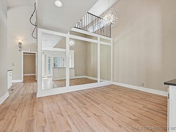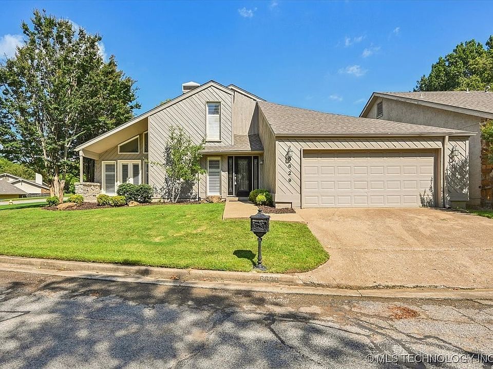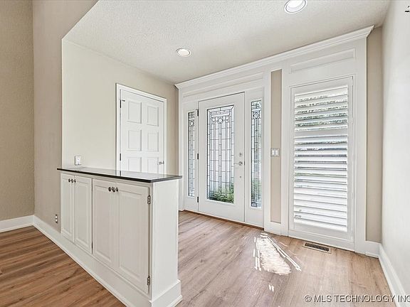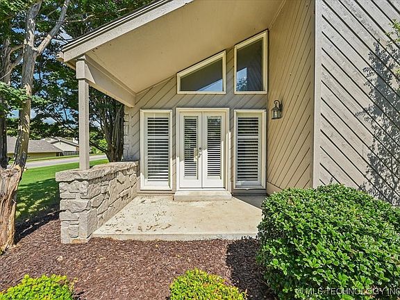 Beautiful and fresh contemporary home on desirable corner lot in Point South. Open concept living with stunning vaulted den with cast stone fireplace. Formal dining with dry bar. Downstairs primary with updated bath and generous walk-in closet. Home boasts three separate courtyards and patios. Abundance of natural light with 2 bedrooms plus living area upstairs. Jenks schools. Neighborhood includes pool, pickleball & tennis courts, and trails.