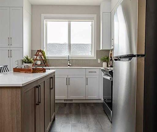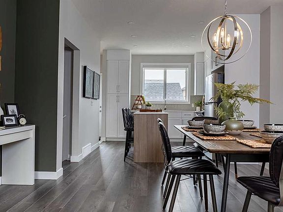 Welcome to the Charlotte by Partners, a paired home thoughtfully designed with style, comfort, and flexibility in mind. This upgraded home features an included side entrance, along with 9’ ceilings on both the main floor and basement. The open-concept main level is anchored by a rear kitchen complete with quartz countertops, full-height MDF cabinetry, soft-close doors and drawers, an upgraded backsplash, chimney hood fan, upgraded gas range, and a stainless steel appliance package including washer and dryer. A central island offers extra prep space, while bright front dining and living areas create an inviting atmosphere filled with natural light. Luxury vinyl plank and luxury vinyl tile flooring run throughout the main living spaces, combining durability with modern appeal. Upstairs, the primary suite includes a walk-in closet and a private ensuite with dual sinks and a walk-in shower. Two additional bedrooms, a full bathroom, and convenient upper-floor laundry complete this level. The basement offers exceptional development potential with 9’ ceilings, rough-in plumbing, and egress windows. Additional upgrades include a rough-in gas line in the kitchen, front landscaping, and a rear lane gravel parking pad. Set in the community of Homestead, residents will enjoy over 4 kilometres of walking paths, a 19-acre natural wetland, and planned amenities including schools, parks, and sports fields. With city transit available and excellent connections across Calgary, Homestead offers a fantastic opportunity for buyers seeking space, modern upgrades, and long-term value in a well-connected location.