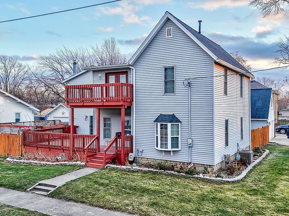 A great family home close to school and downtown. Very nicely renovated 4 bedroom 2 and a half bath home. Beautiful ceramic surrounds in baths. Kitchen has Quartz countertops, stainless appliances, convenient island with sink and counter area. Vinyl plank floor. Master bedroom connects to a 15x14 family/game room complete with a balcony overlooking the yard. Master bath has a whirlpool tub to enjoy and relax. 2023 new York furnace and central air unit. 40 gallon water heater. 2 car 24x24 garage with finished bonus room perfect for your work from home office, Dad's mancave, or a place to send bored teens. 18x33 above ground pool with gas heatr. 18x16 storage shed also included. All measurements approximate.