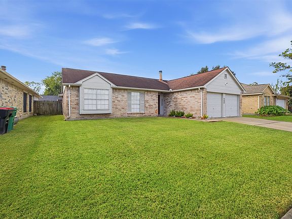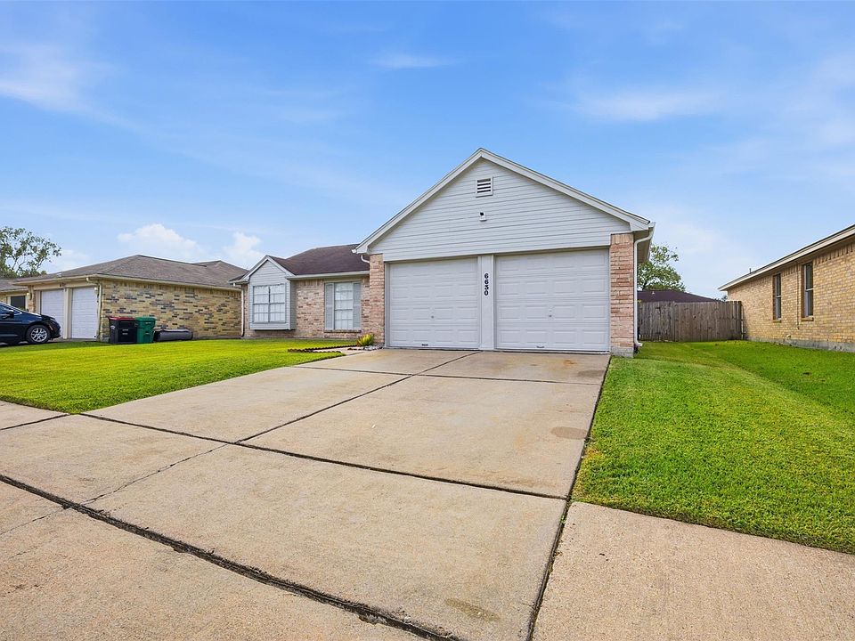 A brick-and-siding single-story home built in 1983 sits on a roughly 6283-sq-ft lot with manicured front lawn and a double-wide driveway leading to an attached two-car garage. The 3-bedroom, 2-bath residence offers about 1517sqft of living space.