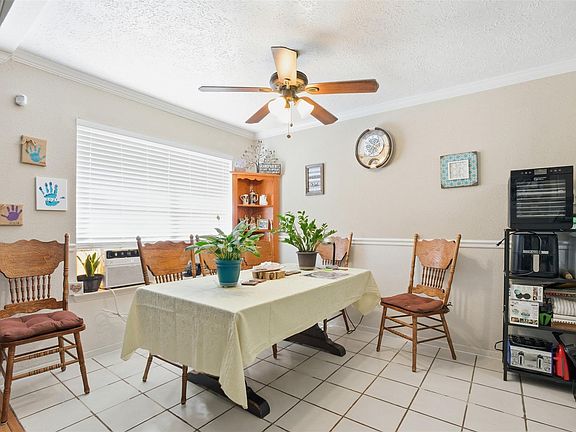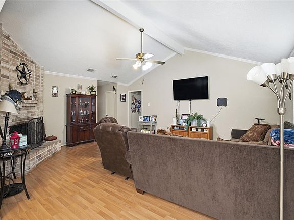 Inside, a vaulted living area features laminate wood flooring, a brick hearth with wood-burning fireplace and ceiling fan, while the adjacent dining room has a picture window, tile floor and chair rail. The galley kitchen includes painted cabinets, dark counters, decorative tile backsplash, white tile flooring and mixed black/white appliances. Bedrooms are carpeted with neutral tones and ample closet space; a flex room with window currently serves as a pantry/office. A covered back deck with corrugated roof and ceiling fan overlooks a fenced yard with storage shed and an in-ground swimming pool surrounded by a textured concrete patio and landscaping.