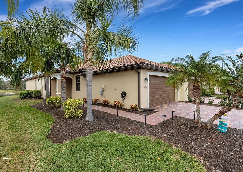 Experience coastal charm in this beautifully designed 2-bedroom, 2-bath villa with a den/flex and 2-car garage. The impeccable kitchen features white painted cabinets, quartz countertops, a subway tile backsplash, and a deep sink with a new garbage disposal (2022). Kitchen-Aid stainless steel appliances were added in 2023, completing the modern aesthetic. The spacious primary bedroom offers tranquil views of the pond and woods. Its ensuite bathroom includes a garden soaking tub, a tiled shower, a double-sink vanity, and his-and-her closets. A split-bedroom floor plan ensures privacy, with a second full bath conveniently located near the guest bedroom. This villa has been freshly painted and thoughtfully upgraded with hurricane-impact windows (2024), a remote-controlled hurricane screen for the lanai (2023), a new HVAC system (2024), and a washer and dryer (2023). Remote-controlled shades enhance the living room, while the screened lanai provides serene views of the pond and wooded area. The main living areas and kitchen feature elegant tile floors and crown molding for added style. The 2 bedrooms and den/flex has new luxury vinyl plank installed (2022). Included with this home is a coveted social membership, granting access to a wide array of amenities: two fitness centers, eight HAR-TRU lighted tennis courts, two resort-style pools, a resistance swimming pool, six satellite pools, a 20,000-square-foot clubhouse, restaurants, pickleball courts, and a half basketball court. Enjoy maintenance-free living with lawn care and exterior upkeep included. Conveniently located near Tampa, St. Petersburg, Sarasota, Bradenton, Lakewood Ranch, and world-renowned beaches like Anna Maria Island and Siesta Key, this home is close to premier shopping, dining, and entertainment. Nearby attractions include UTC Mall, Costco, Ellenton Outlet Mall, Super Target, Whole Foods, Hobby Lobby, and Academy Sports—many just a golf cart ride away! Additional details: Buyers pay a one-time $1,000 capital contribution to Heritage Harbor and a $2,500 capital contribution to River Strand. The CDD fee is included in the tax amount. There is a $750/year food minimum, and rental restrictions require a 30-day minimum, up to 12 times a year. This Lennar Orchid model is ready for you to enjoy luxury living at its finest! Water $80 Electric $105 Cable and internet are included in HOA fees. Flood insurance required. Typically $800-$1000 annual.