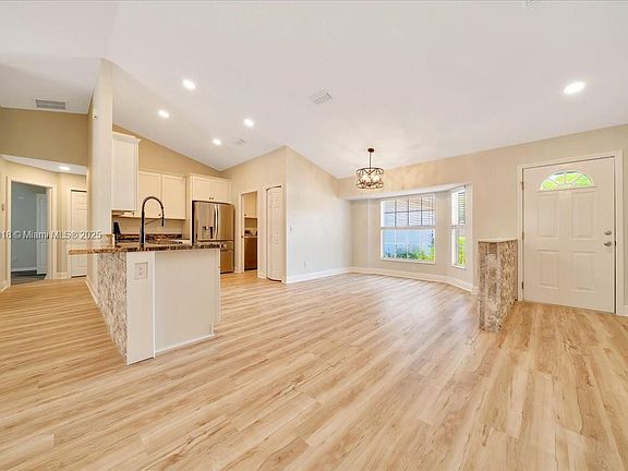 Originally built in 2003 by Murphy Kaufman, this 4-bed, 3-bath pool home with private in-law suite has been fully renovated in 2024–25. The entry was opened to create a spacious flow between kitchen and great room, with new Shaw luxury vinyl plank flooring throughout. The kitchen features solid wood cabinets, quartz countertops, farmhouse sink, LG stainless appliances, gas cooktop, and restructured island. The master suite offers pool access and a spa-like bath with garden tub, dual-head shower, and quartz finishes. All baths are updated with modern fixtures. Other upgrades include new baseboards, paint, lighting, fans, and custom trifold glass doors leading to a refreshed pool area. The in-law suite has its own entrance, kitchen, HVAC, and full bath.