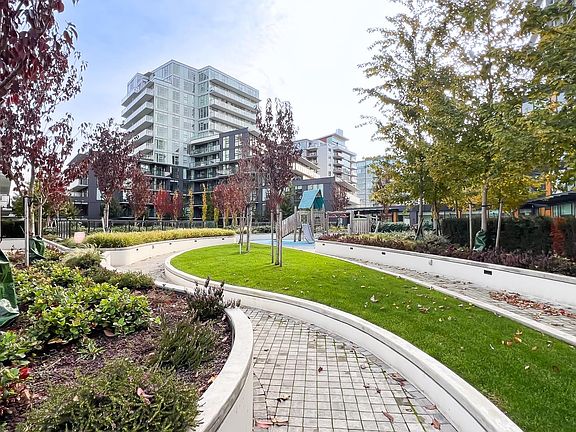 "One Park" in the heart of Richmond. The apartment offers a serene yet conveniently located setting, super convenient shopping & transportation. 8'6" ceilings; open kitchen featuring Miele gas cooktop, electric oven, panelled 30" fridge, & DW, Panasonic microwave, quartz countertops & 21sf walk-in pantry w/Blomberg W/D; laminate & tile flrs thru-out. Enjoy your views of north shore mtns, city & Mt Baker. 1 EV-ready parking + 1 bike locker. Extensive amenities: gym; sauna & steam rms; yoga, dance & table tennis rms; rec rm w/pool table; lounge w/chef's kitch; sound-proof music rms; + 31,000sf terrace w/garden plots, BBQ area, playgrnd & water feature. Pets & rentals friendly.