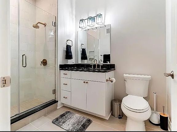 The sleek kitchen is equipped with stainless steel appliances (2023), custom granite countertops, soft-close cabinetry, and statement lighting perfect for cooking or entertaining. A separate laundry area includes an in-unit washer and dryer (2023) for added convenience.