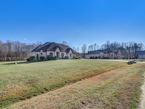 First floor living! 4 bdrms including master on first floor. Beautiful appointments throughout w/heavy crown moldings that accentuate the 10 ft ceilings. Home invites guests in w/large entry & open floor plan that flows out to screened in porch w/fp & out to a patio w/bar & firepit. Master bath has heated floor, spa like amenities. Upscale finishes w/built-ins in family room & breakfast area. Large lot that backs up to Haw River! In Oak Ridge Elementary, & NW Middle and HS district. See 360 virtual tour!