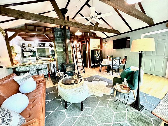 Discover your serene waterfront retreat! Beautifully redesigned cottage, nestled atop a mountain, offers breathtaking views of a tranquil pond w/ its own tiny island. Accessible via a private road, this property provides a secluded mountain camp feel on a 2.5-acre wooded lot. Main house just over 1,000 sq ft, has two cozy bedrooms, great room featuring a cathedral ceiling, wood burning stove & loft. Kitchen flows into the great room & includes a breakfast bar & a walk-in pantry. Bathroom, fully renovated in 2021, adds a modern touch to this rustic home. Step outside through sliding glass doors to a deck offering stunning sunset views over the water. Additional space is provided by the loft, partial basement, & multiple storage sheds. A short walk down to the water's edge reveals approx. 300 ft. of waterfront, complete with a dock on the stocked pond. 2019 Mennonite-built cabin by the water will quickly become your favorite spot for relaxation & play. Located just minutes from Bristol Mountain & a short drive to Canandaigua, Naples, & the best of the Finger Lakes. Your idyllic waterfront escape awaits! NOTE: This property can not be used for short term rentals.