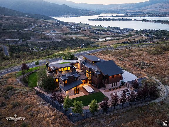 Set high above the valley in the exclusive, gated Hawkins Creek community, this extraordinary estate-crafted by renowned architect Greg Steffensen-is a true expression of refined mountain living. Situated on over two acres, the home captures sweeping panoramic views of Pineview Reservoir and Snowbasin Ski Resort, creating an inspiring backdrop for those drawn to both natural beauty and outdoor adventure. Every element of the home is designed with intention, from radiant heating on the main and upper levels to soaring vaulted ceilings and robust steel-frame construction. Expansive floor-to-ceiling windows flood the interiors with natural light and perfectly frame the surrounding landscape. The great room makes a lasting impression, with exposed beams, rich hardwood floors, and multiple fireplaces that add warmth and elegance. Tailored for both comfort and entertainment, the residence features an indoor sports court, a professional-grade exercise room, and a stadium-style theater. A wine room and sleek bar elevate the experience, while the chef's kitchen-complete with a Wolf six-burner range, dual islands, and custom cabinetry-delivers both form and function. Just off the kitchen, a cozy lounge with a fireplace and two retractable glass walls offers an ideal space for quiet reflection or intimate gatherings. The primary suite is a tranquil sanctuary, showcasing floor-to-ceiling glass sliders that reveal uninterrupted views of the lake and mountains. The suite includes a luxurious walk-in closet and a spa-inspired bath, complete with designer sinks and a ceiling-fill soaking tub for the ultimate in relaxation. A striking glass bridge leads to a private wing featuring an additional bedroom with ensuite bath, a dedicated office, and its own balcony-perfectly balancing privacy with convenience. The home also offers two spacious two-car garages, a fully fenced backyard, and a professionally landscaped patio. Outdoor amenities abound, including a swim spa with a powered cover, a gas firepit for year-round enjoyment, and a heated driveway and patio walkway for seamless winter living. A backup generator ensures peace of mind, and the home is thoughtfully designed to accommodate a future elevator if desired. From its dramatic design to its unmatched setting and amenities, this property stands as a true one-of-a-kind retreat-an exceptional blend of architectural excellence, modern comfort, and mountain elegance. Buyer to verify all.