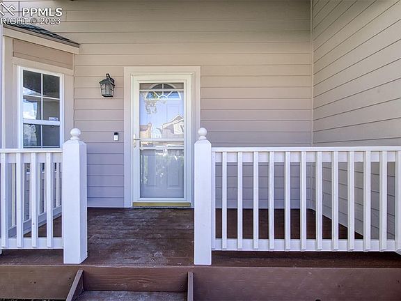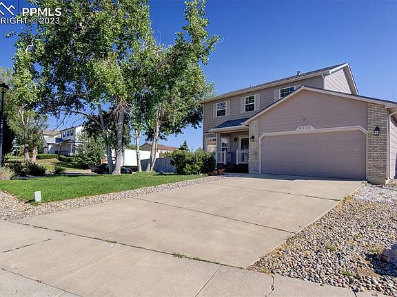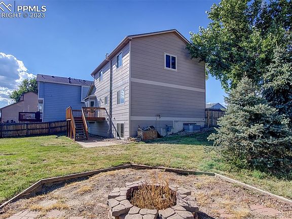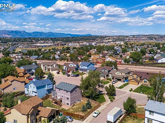 This lovely two-story home has a welcoming covered front porch and is located on a large cul-de-sac lot. The back yard is fenced and provides plenty of space for yard games or for pets to run! The mountain views from the deck are beautiful, and; when evening comes the fire pit is perfect for roasting hot dogs or making Smores. As you step into the house from the front porch the entry opens to a large Living/Dining Room. The kitchen at the rear of the house can be accessed from the Dining Room or from the front entry hallway. In the kitchen is an island with space for casual dining, newer appliances, and a large pantry. The kitchen opens to a large family room with a gas fireplace. From the family room the backyard deck, the garage, and the main floor half-bath are conveniently located. Upstairs are three bedrooms. The Primary bedroom suite contains a 5-piece bath and a large walk-in closet. The fourth bedroom is in the basement as is the laundry. Features that make this house move-in-ready are NEW Exterior Paint, NEW Interior Paint, NEW Roof, a NEW Garage Door, a NEW kitchen sink & NEW Hot Water Heater. This home is only minutes away from shopping, military bases, and major roadways. (Photos with furniture are Virtually Staged)
