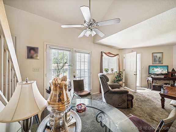 Updated Second Level, 2-story condo with 3 bedrooms and 1 full bathroom. Located close to Riverside & Tulsa Hills (shopping, food, and entertainment). Easy access to highways. An HOA is in place to take care of exterior maintenance, groundskeeping, and trash/sewer/water. Vaulted ceiling in the living room with fireplace and balcony. Upstairs bedroom (flex room) has a balcony also. Reserved covered parking. Pool available.
