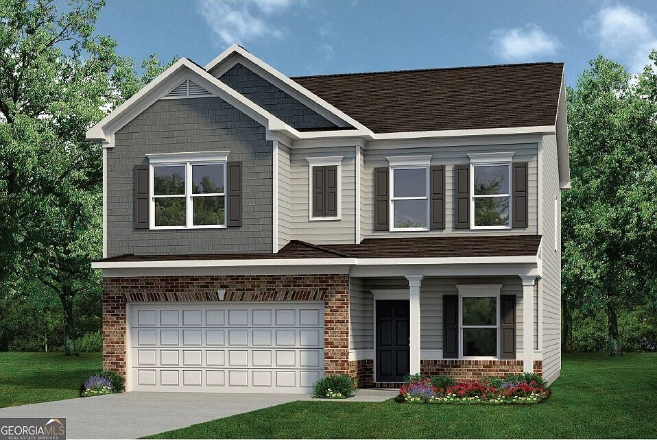 Move in October 2025! The Coleman at Evergreen at Lakeside by Smith Douglas Homes. This 4BR/2.5BA home greets guests with a roomy foyer with chair rail/shadowbox trim that opens to a study and flows to an open concept living/dining/kitchen area. The large eat-in kitchen, features granite countertops, upgraded 42" cabinetry, an island, stainless steel appliances and is adjacent to the family room with a linear fireplace. Vinyl Plank floors on main level. An open iron staircase leads to the second story where you will find the Owners suite, three generous bedrooms, a shared bath, and a convenient laundry room. Large closets add an amazing amount of storage. Both floors have 9ft ceiling heights. Sited on a cul-de-sac with wooded views!!!Photos representative of plan not of actual home being built. Seller incentives with use of preferred lender.
