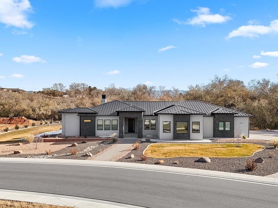 Architectural masterpiece that embodies modern elegance, with its sleek lines showcased. Breathtaking views of the Colorado National Monument. Durable luxury vinyl plank flooring throughout. This stunning new home is situated on 1.23 Acres. Fully landscaped with majestic native plants & trees. The kitchen is a culinary heaven- beautiful custom floor-to-ceiling cabinets, with granite counters. Gold textured backsplash, stainless steel appliances. The primary bedroom is a dream come true. With a large walk-in shower & steam room, this home truly has it all. a must-see!