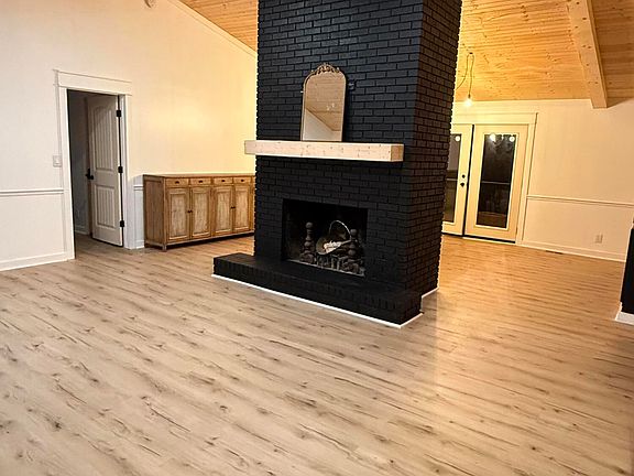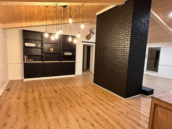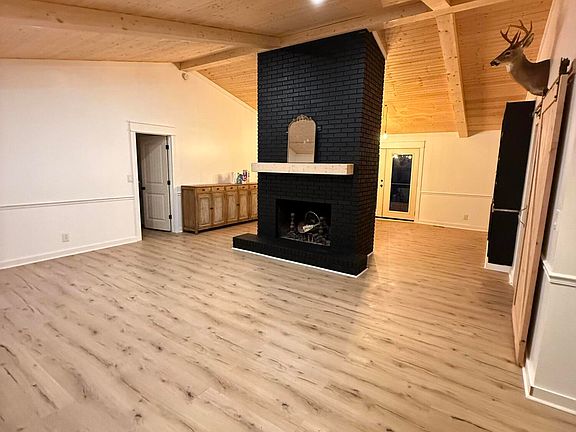 Step inside to find natural cathedral pine ceilings with exposed beams in the great room and dining area, separated by a cozy all-sided exposed fireplace- with built-in cabinets and shelving.