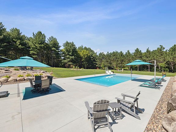 Discover tranquility in this walkout rambler on 4.5 acres with a secluded and fenced backyard, 20' x 40' saltwater sport pool with 6' sundeck and hot tub. Vaulted ceiling with rustic beams and windows that frame the serene views surrounding your oasis. Gas fireplace in living room flanked by gorgeous built in cabinets. Spacious kitchen with pantry, impressive alder cabinets, granite counters, slate tile accents and beautiful floors. Convenient laundry and 3/4 bath off garage. Primary bedroom en-suite with tray vault ceiling, walk-in shower, closet, dual sinks and a dedicated office space is adjacent. Lower level boasts three additional spacious bedrooms, family room, full bathroom, ample storage, and walk-out to the patio. Maintenance free deck, 24’ x 40’ garage with room for additional building if desired. Generac whole house generator included. Easy access to the highly sought after Willow River State Park; an AMAZING lot!