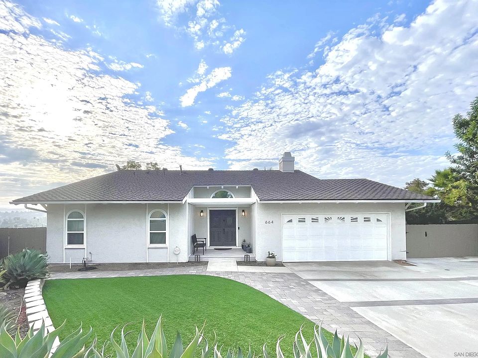 Welcome to 664 Schafer Place! Nestled at the end of an elevated/quiet cul-de-sac, overlooking the city with breath-taking views, you’ll find this stunning 4 bedroom, 2.5 bath home. Step inside to an open floor plan with a custom modern kitchen, cozy family room with elegant built-in, and dining room, all with expansive windows and a 3-panel slider to take in the panoramic views of the mountains and city. You’ll find 3 generously sized rooms, a hall closet, and 1 full bath on the lower level; a half bath and the master suite with a beautifully custom en-suite master bathroom on the entry level. This home has been carefully crafted and updated over the last 7 years by the sellers. Dual-pane windows and doors throughout, matched with a new energy efficient HVAC system (installed summer of 23’), will ensure desirable comfort both in summer and winter. This home has continuously used less energy than efficient homes according to the seller’s SDGE energy report. This is due to the entire house being retrofitted with efficient LED lighting, smart switches throughout, a smart thermostat, a Quietcool whole house fan, Quietcool attic fan, new A/C, and more. Fantastic curb appeal with the beautifully redone front yard, and an amazing entertainer’s back yard. Recent concrete work with a custom built oversized gazebo for endless hosting and gatherings. You will also not be bothered with backyard neighbors as there is a 2-acre field behind the residence. No HOA or Mello-Roos fees!