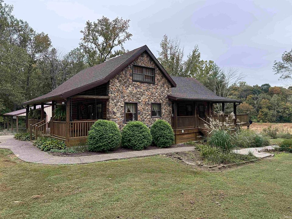 Perfect combination of log and stone home, with a large pole barn, pond on 7 acres in the country. Francisco address, near Wheeling. 20 minutes from Toyota in between Petersburg, Princeton and Oakland city. The layout includes a large kitchen, living room, dining room with half bath on the main floor. The dining room could be made into a bedroom. Three beds upstairs with a full bath. The walk out basement includes a half bath that could be easily turned into a full bath. Appliances and ventless gas stoves included as well as a wood burner and an above ground pool stored in the garage. Most of the exterior wood is under porch roof on three sides. Utilities include Spectrum, Pike Gibson Water and Win Energy.
