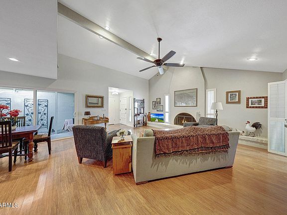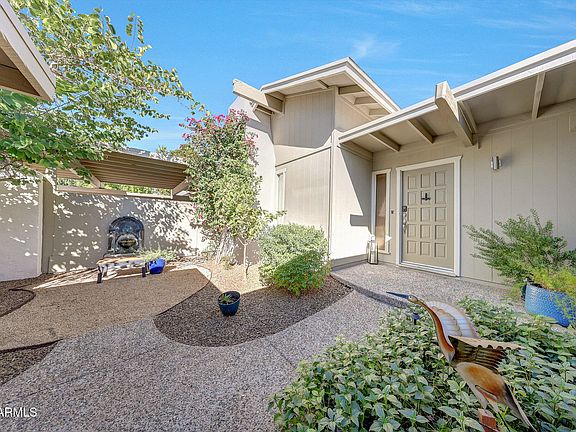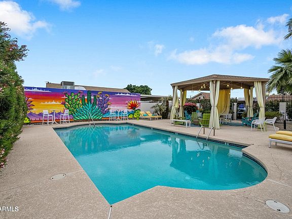 This beautifully maintained, single-level patio home features an open floor plan with 2 spacious bedrooms, 2 bathrooms, and an indoor laundry room in a charming North Central Phoenix community. The great room offers vaulted ceilings and a wood-burning fireplace, and opens directly to the kitchen, which includes stainless steel appliances along with generous counter and storage space. The kitchen and great room are enhanced by two large sliding glass doors that open to an expansive patio, bringing in natural light and creating a seamless indoor-outdoor living experience. The primary bedroom includes a walk-in closet with built-in shelving and its own private exit to the quiet patio. Enjoy multiple outdoor living areas: a welcoming front patio shaded by mature trees and a private, beautifully landscaped rear patio! The home sits on one of the larger lots in the community, providing additional outdoor space and enhanced privacy. Interior highlights include ample storage throughout and a covered 2-car carport with multiple storage closets. The location is tucked away from traffic noise yet minutes from restaurants, grocery stores, and the nearby canal path for walking or biking. Quick access to SR-51 makes commuting to downtown and surrounding amenities effortless. Residents also enjoy a stylish pool area with a cabana and artistic mural, creating a retreat just steps from home.