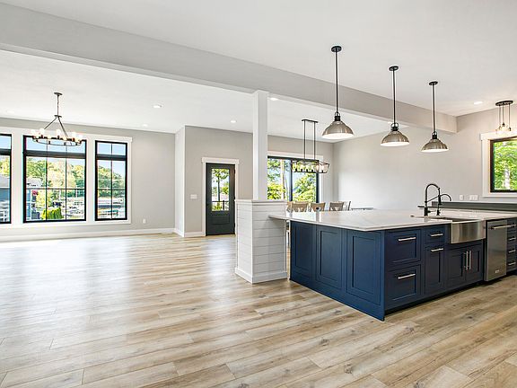 The open-concept main level impresses with soaring 10-foot ceilings and 8-foot doors, establishing an airy, grand atmosphere that is further enhanced by floor-to-ceiling windows, which extend the light-filled theme. At its heart, a stunning chef's kitchen commands attention—showcasing a dramatic marble center island, accented by expansive quartz countertops, premium appliance package and oversized walk-in pantry. The adjacent dining area flows seamlessly to a sprawling outdoor deck, perfect for entertaining or enjoying al fresco meals. This level also features a spacious great room anchored by a striking fireplace, private office, elegant powder room, discreetly positioned laundry room and mudroom worthy of a design magazine. The main-level primary suite is a private sanctuary. With vaulted beam-accented ceilings, stately gas fireplace, motorized shades, a spa-inspired bath with custom tile multi-head shower, dual vanities and an expansive walk-in closetall complemented by sweeping views of the water.