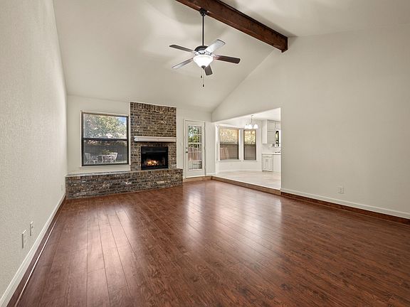 Brick fireplacePrivate backyardGrassy spaceUpdated countertopsBuilt-in serving areaVaulted ceilingsLarge deck