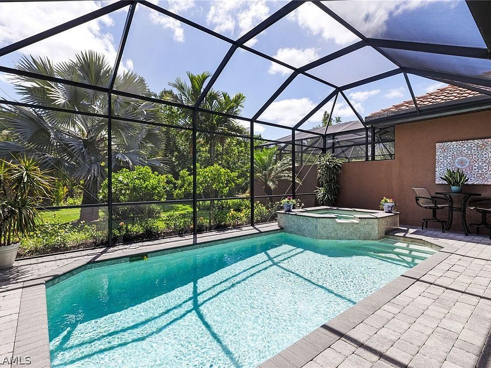 This stunning villa boasts a range of upscale features, including stainless steel appliances, quartz countertops, crown molding, and high ceilings. Enjoy peace of mind with IMPACT DOORS and WINDOWS, along with the added elegance of plantation shutters. The epoxy two-car garage provides convenience, while the heated pool and spa offer relaxation in your own private oasis.