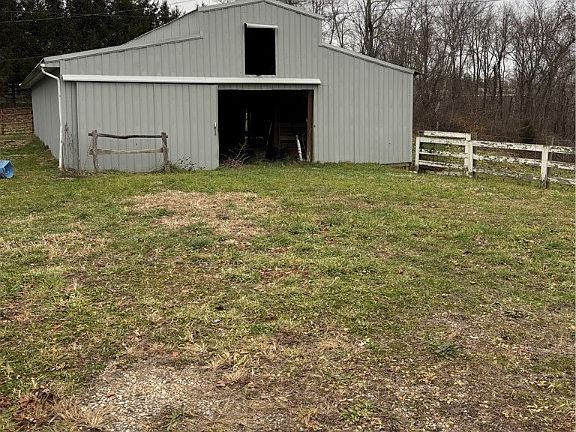 Welcome To The Ridge. Located only minutes from Salt Fork State Park right off SR22 on Larrick Ridge is this 4.84 acres mainly pasture with a 50' x 36' horse barn with 8 stalls with a metal roof and siding. Also, a 24'x24' garage (half of the floor is concrete) including two 12' x 24' Lean-To structures. Water faucets at both barn and garage. Separate electric meters from house. Outside security lights at house and garage. The 1342 sq ft house features 2-3 bedrooms, full bath and two half baths. Beautiful flooring. Convenient laundry on first floor, as well as, hook ups in the walk out basement. Large deck and covered Gazebo give great curb appeal to this home. All appliances stay. Seller will retain Mineral Rights.