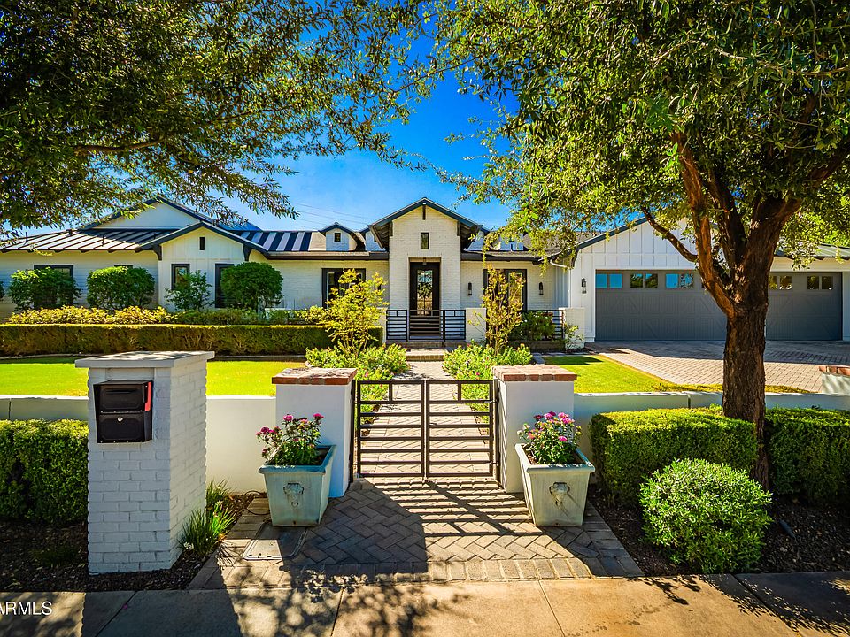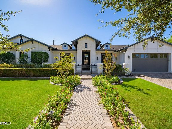 Located in Arcadia Proper, this refined modern farmhouse blends upscale design with relaxed livability on a large corner lot with manicured landscaping, white rose accents, mature oak trees, and beautiful Camelback Mountain views. The exterior was just professionally repainted, creating timeless curb appeal. Inside, warm wood tones and rich architectural detail enhance the inviting atmosphere. The vaulted family room features exposed wood rafters and a classic fireplace, while the designer kitchen showcases a Sub-Zero refrigerator, La Cornue range, and marble and Caesarstone Quartz surfaces. A rare Arcadia Proper offering.