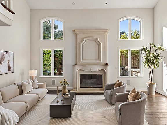 Set at the end of a private cul-de-sac in prime North Los Altos, this timeless home blends classic curb appeal, modern comfort, and low-maintenance, resort-style outdoor spaces. A freshly painted exterior with contrasting trim and a tall, peaked front porch welcomes you to the home, and inside, deep-hued hardwood floors carry through every spacious room along with high ceilings, abundant light, and thoughtful craftsmanship. The impressive living room centers around a cast-stone fireplace and enjoys soaring two-story ceilings, while the adjoining dining room opens easily to the yard for seamless entertaining. The chef's kitchen features quartz countertops, a center island, and premium stainless steel appliances. The main level hosts three bedrooms, including the incredible primary wing with its own exercise or sitting room and office. Upstairs, you have a versatile family room with a fireplace and wet bar, a bedroom, and a bathroom, creating ideal guest or media space. The immensely private backyard oasis features multiple flagstone patios that wrap around the home, an extensive barbecue island, fireside patio, and a sparkling pool and spa surrounded by lush greenery. Moments to downtown Los Altos and top-rated schools!