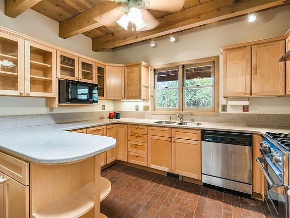 Located minutes to the Plaza, and Canyon Road, this light-filled Santa Fe Style home has everything! Built the by respected Jim Hayes, the great room features floor to ceiling windows that open to a private patio and green belt with foothill views. Finishes included Saltillo tile floors, beams and latillias, high ceilings, two kiva style fireplaces, built in shelves and so much more. The updated kitchen is modern and fabulous. The split floor plan provides privacy to the spacious master suite with walk-in closets and large, tiled bathroom. On the other side of the home is the office/bedroom, full bath and third bedroom. Below the patio are garden beds and a large, clean dry storage shed. The home is 1,940 square feet on .466 acres of land. The entry drive is lined with stone work and garden beds. A third private patio is located off of the dining room, for entertaining and enjoying life. There is also a 2-car garage with storage shelves. FURNITURE INCLUDED, making this property turn-key!